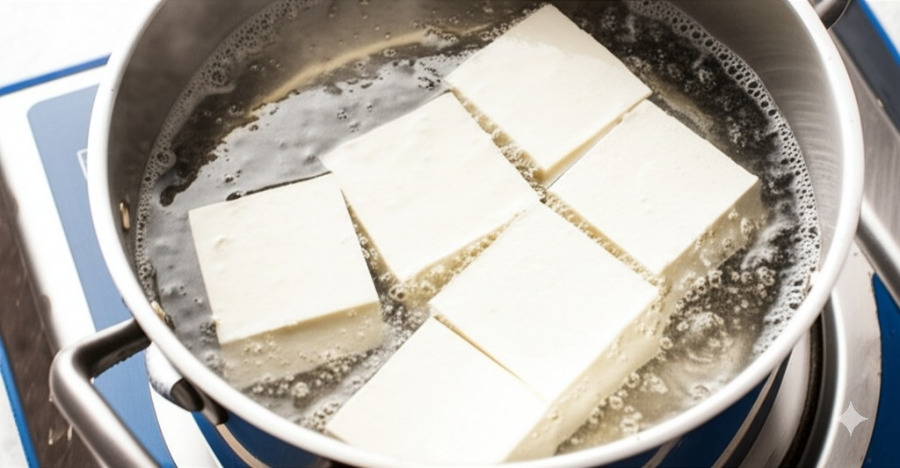 <이미지: 끓는 물에 두부를 넣고 데치는 모습>