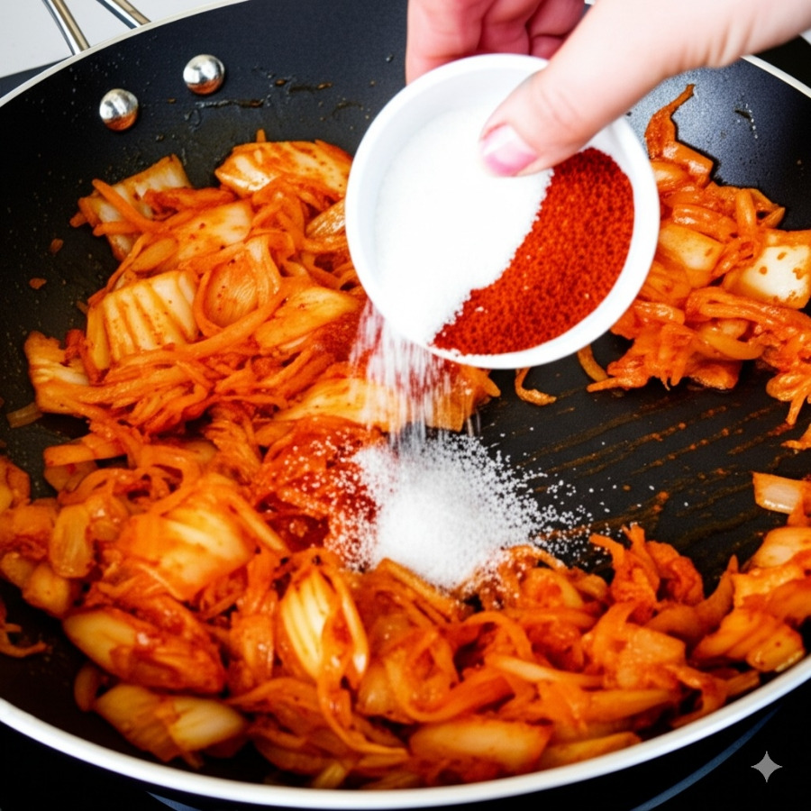 <이미지: 설탕과 고춧가루를 넣고 김치를 볶는 모습>
