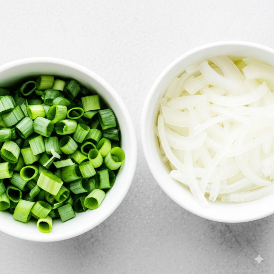 <이미지: 채 썬 양파와 어슷 썬 대파 모습>