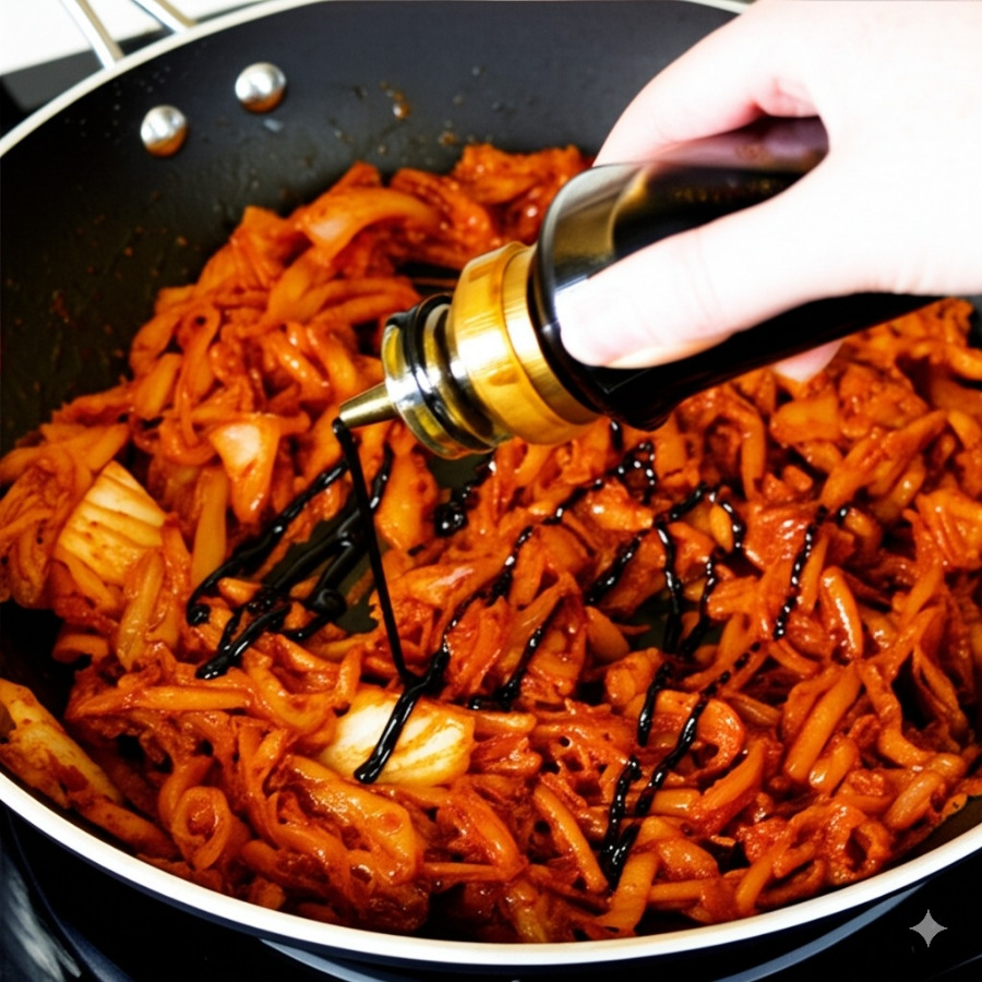 <이미지: 완성된 볶음김치에 참기름과 깨소금을 뿌리는 모습>