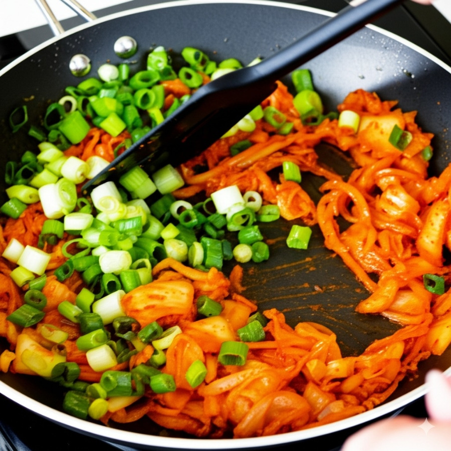 <이미지: 대파를 넣고 볶음김치를 마무리하는 모습>