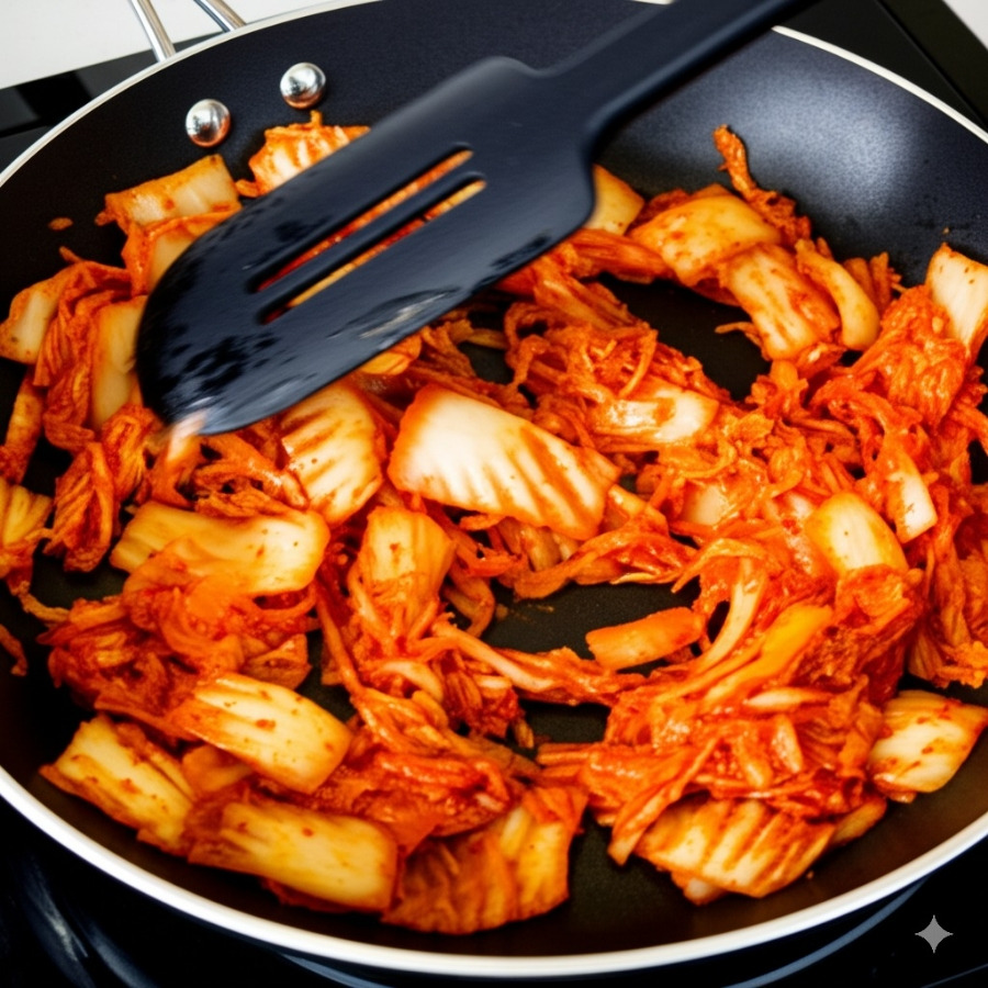 <이미지: 설탕과 고춧가루를 넣고 김치를 볶는 모습>