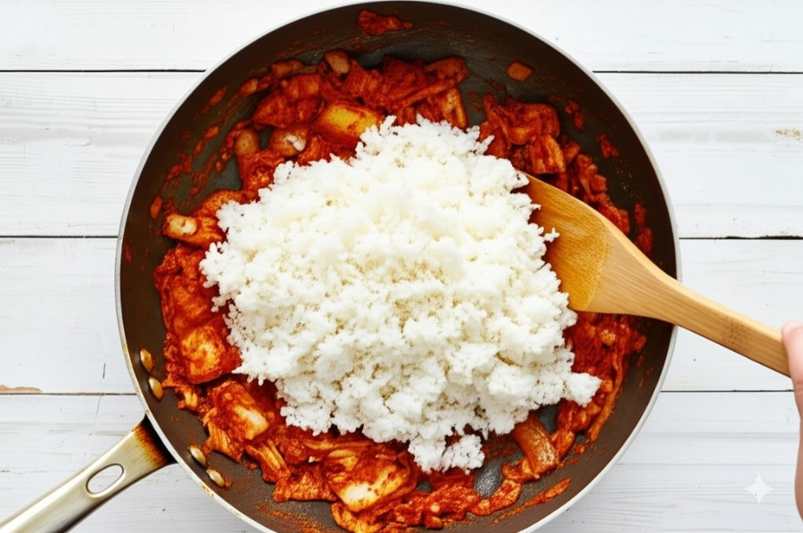 * 밥을 넣고 주걱으로 으깨듯이 잘 섞으면서 볶아줍니다. 밥알이 골고루 풀어지고 양념이 잘 배도록 볶는 것이 중요해요.