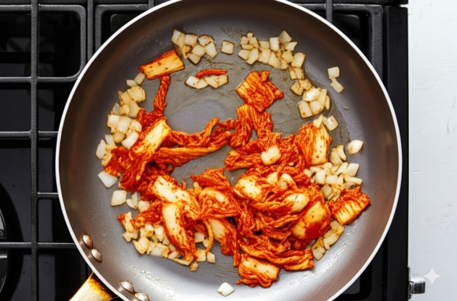 * 중불로 달군 팬에 식용유 또는 참기름을 두르고 (선택) 돼지고기 또는 양파를 먼저 볶아줍니다. 돼지고기가 어느 정도 익으면 김치를 넣고 함께 볶아주세요.