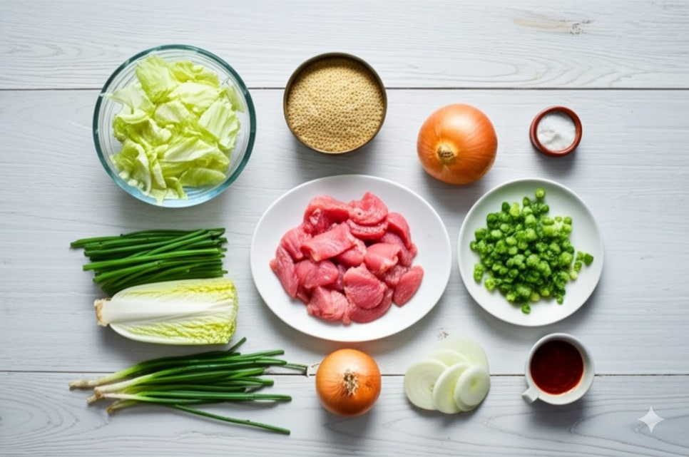 <이미지: 제육볶음 재료 (돼지고기, 양파, 대파, 양배추, 고추장, 고춧가루, 간장 등)>