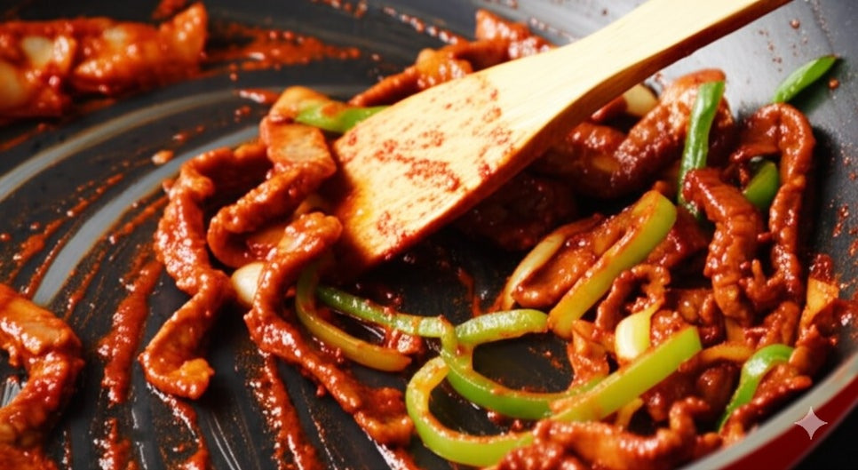 <이미지: 완성된 제육볶음 (윤기가 흐르는 빨간 양념에 돼지고기와 야채가 어우러진 클로즈업 사진, 김이 살짝 나는 모습)>