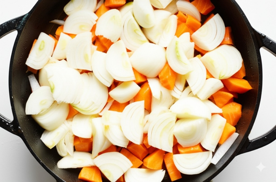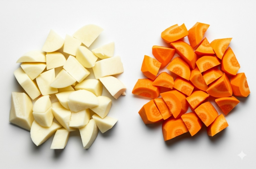 **<이미지: 깍둑썰기한 감자와 당근>**