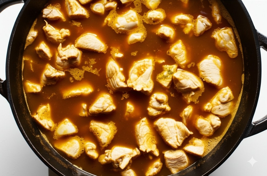 **<이미지: 냄비에 닭고기를 볶는 모습>**