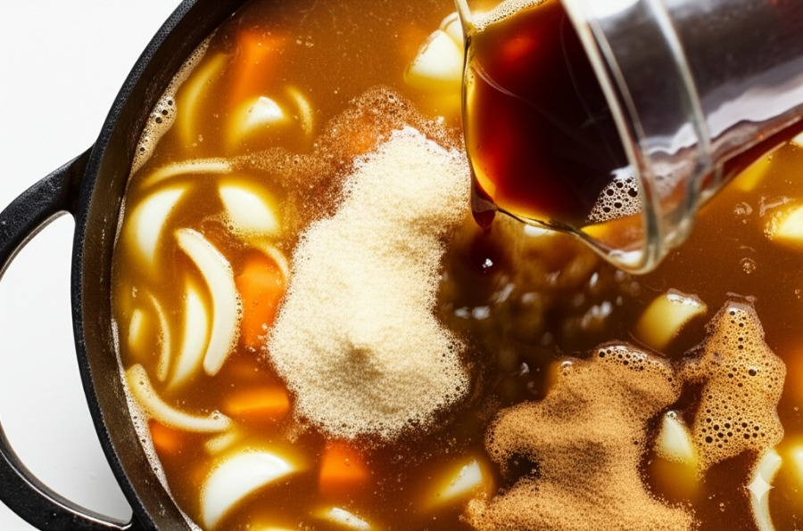 **<이미지: 양념과 물을 붓고 끓이는 모습>**