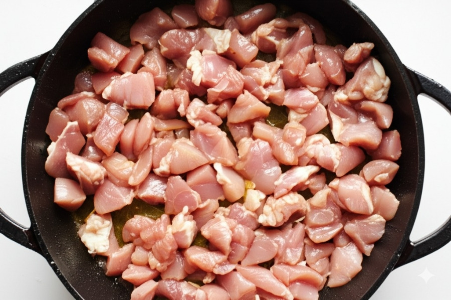 **<이미지: 냄비에 닭고기를 볶는 모습>**