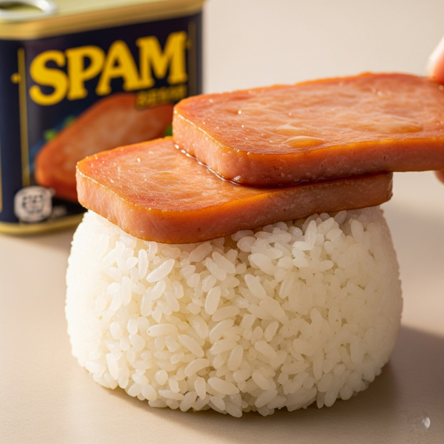 <이미지: 스팸 주먹밥 재료 (밥, 스팸, 김자반, 참기름 등)>