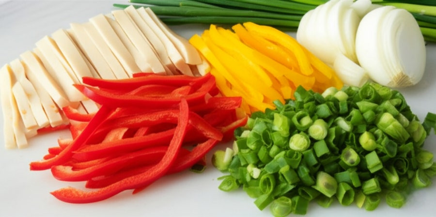 <이미지: 사각 어묵과 양파, 당근, 파를 도마 위에서 먹기 좋게 썰어둔 모습.>