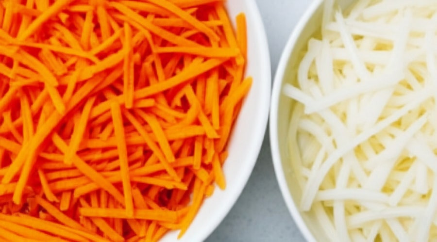 <이미지: 채 썰어 놓은 양파와 당근이 접시에 담겨 있는 모습.>