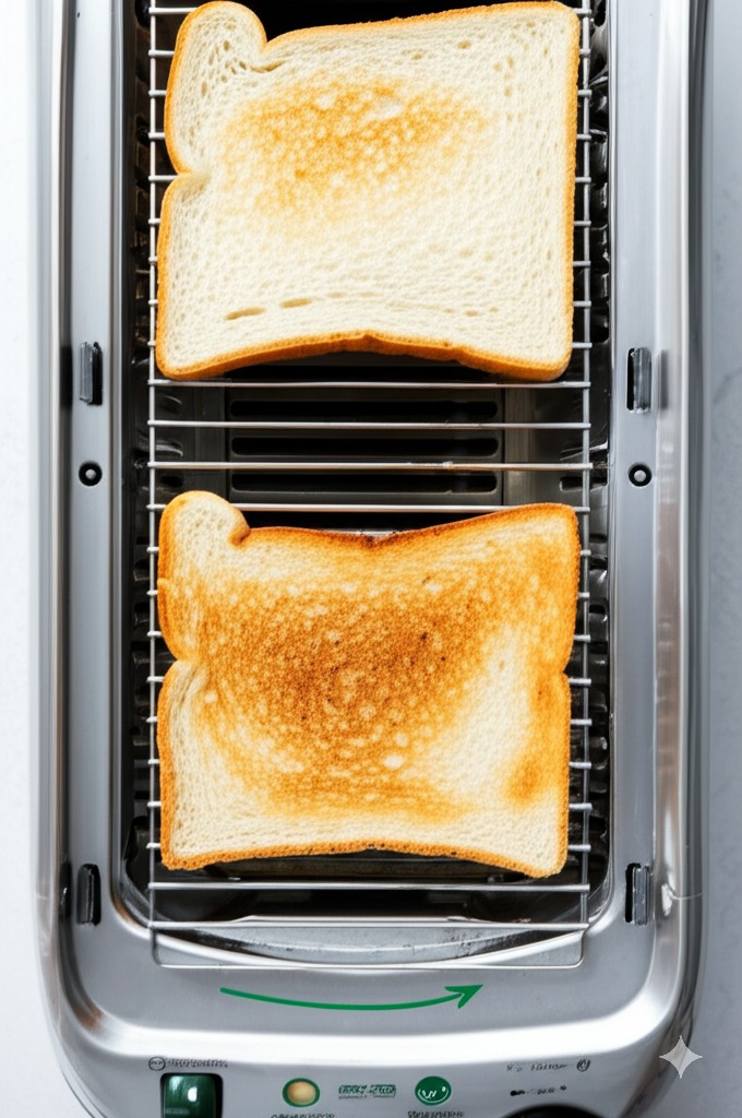 **<이미지: 토스터에 식빵을 굽거나 팬에 버터를 녹여 식빵을 굽는 모습>**