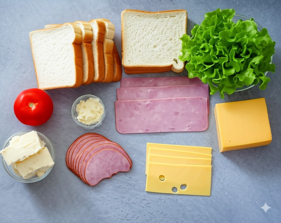 **<이미지: 햄치즈 샌드위치 재료 (식빵, 햄, 치즈, 마요네즈, 양상추, 토마토 등)>**