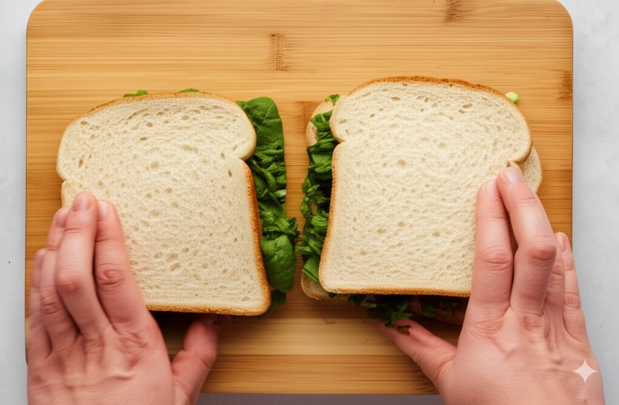 **<이미지: 속 재료를 올린 빵 위에 다른 빵을 덮어 샌드위치를 완성하는 모습>**