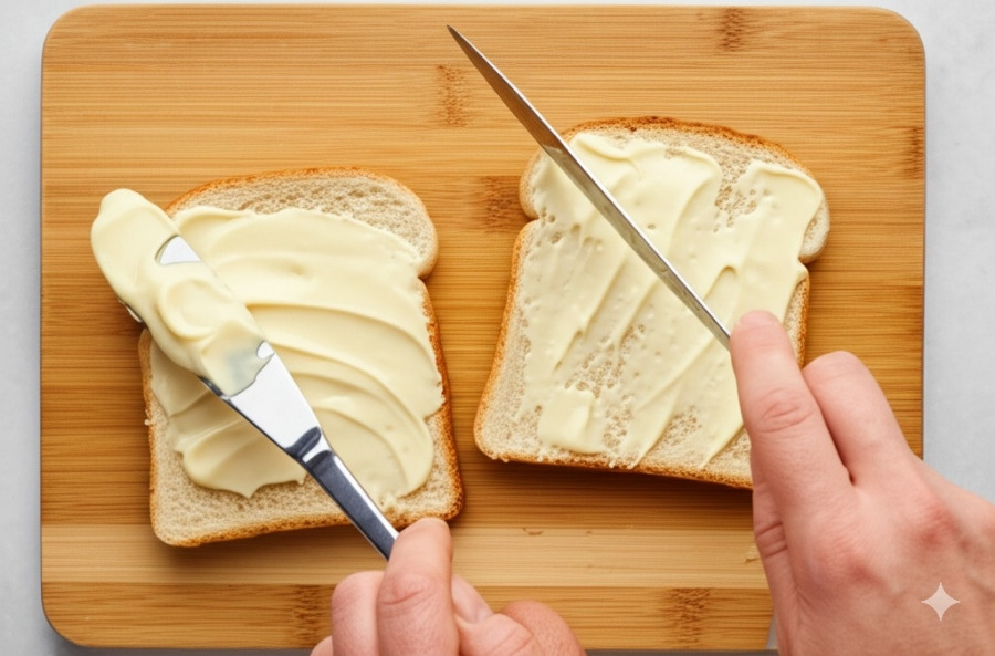 **<이미지: 식빵에 마요네즈와 머스타드를 바르는 모습>**
