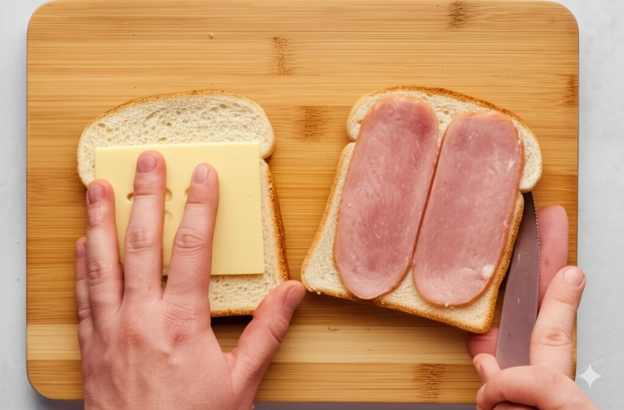 **<이미지: 빵 위에 햄과 치즈를 차례로 올리는 모습>**