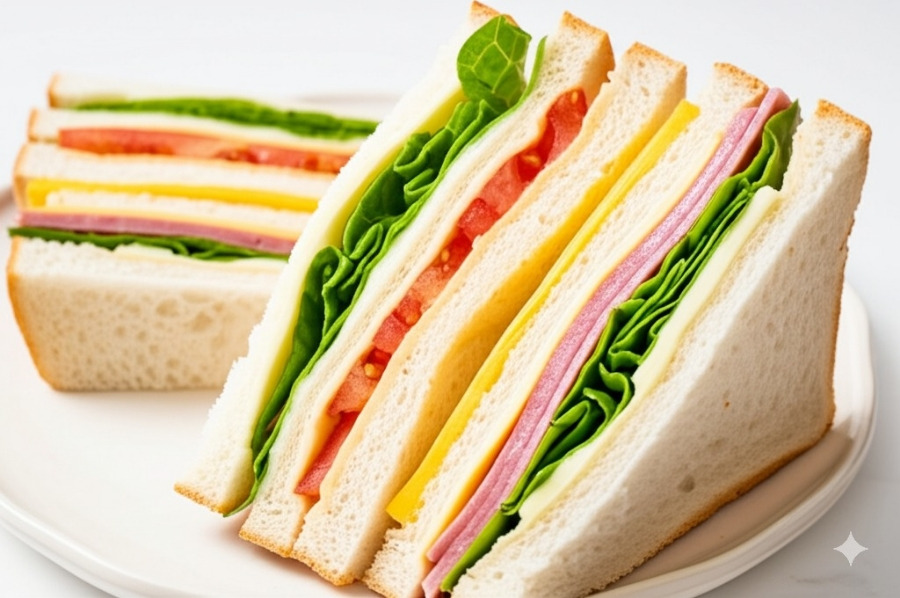 **<이미지: 먹음직스럽게 반으로 잘린 햄치즈 샌드위치 (빵, 햄, 치즈, 양상추, 토마토 등이 층층이 쌓여있는 단면이 잘 보이는 클로즈업 사진)>**
