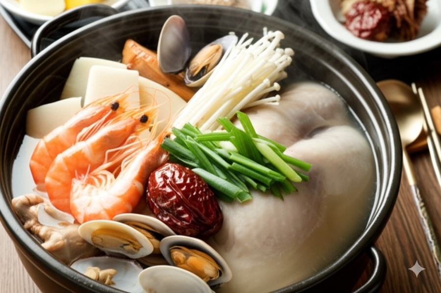 <이미지: 닭 육수에 해산물을 넣고 끓이는 모습>