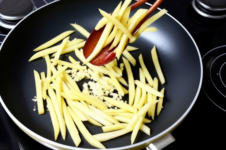 <이미지: 달궈진 팬에 기름을 두르고 썰어 놓은 무와 다진 마늘을 넣어 주걱으로 볶는 모습.>