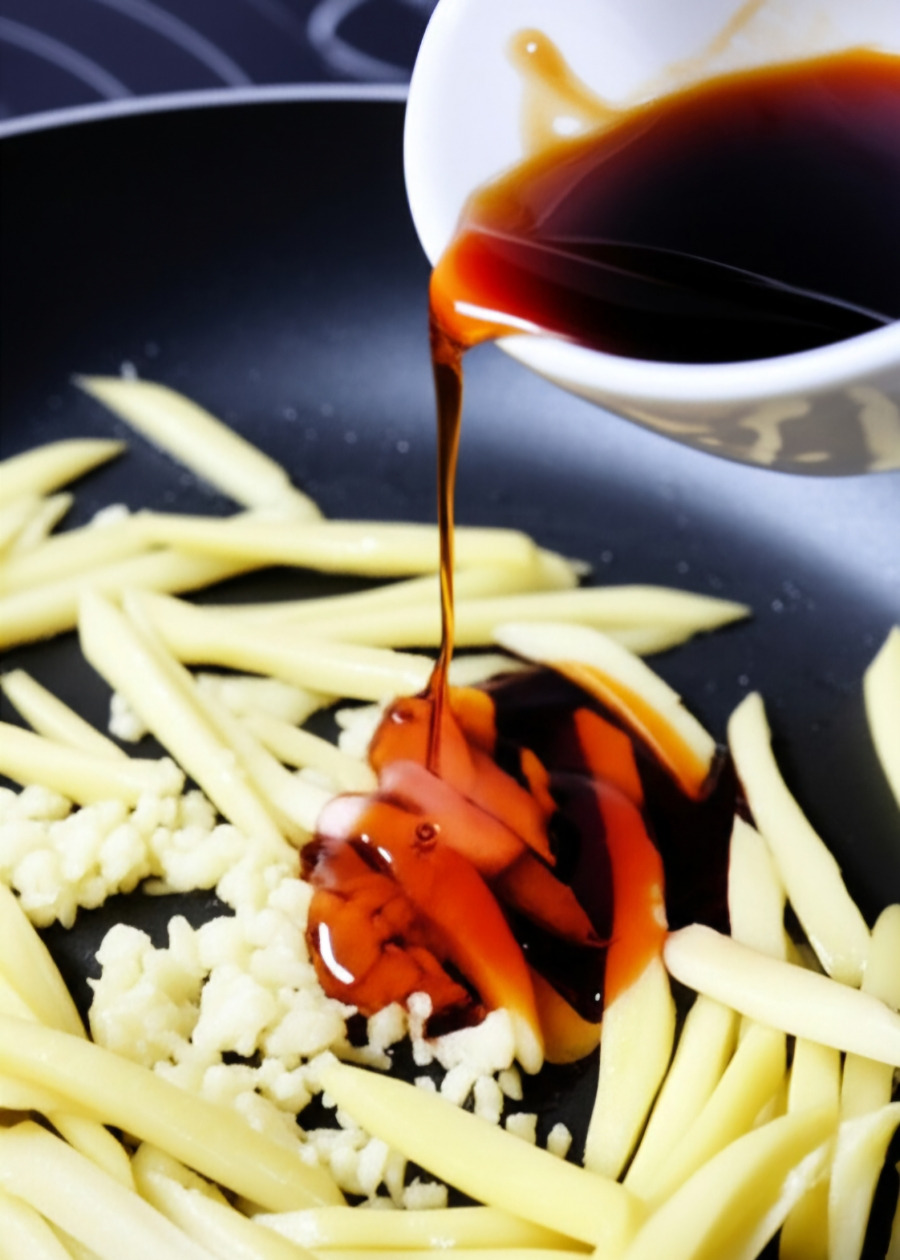 <이미지: 볶고 있는 무에 국간장을 부어 함께 볶는 모습.>