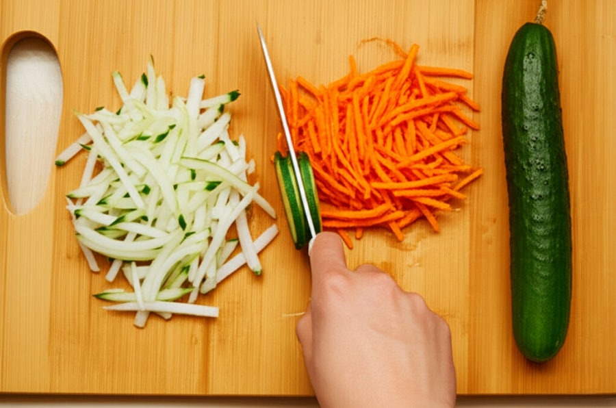 ② 맛살은 손으로 잘게 찢거나 칼로 가늘게 채 썰어줍니다. 양파는 곱게 채 썰어 찬물에 5분 정도 담갔다 물기를 빼 매운맛을 제거하고, 오이나 당근도 가늘게 채 썰어줍니다.