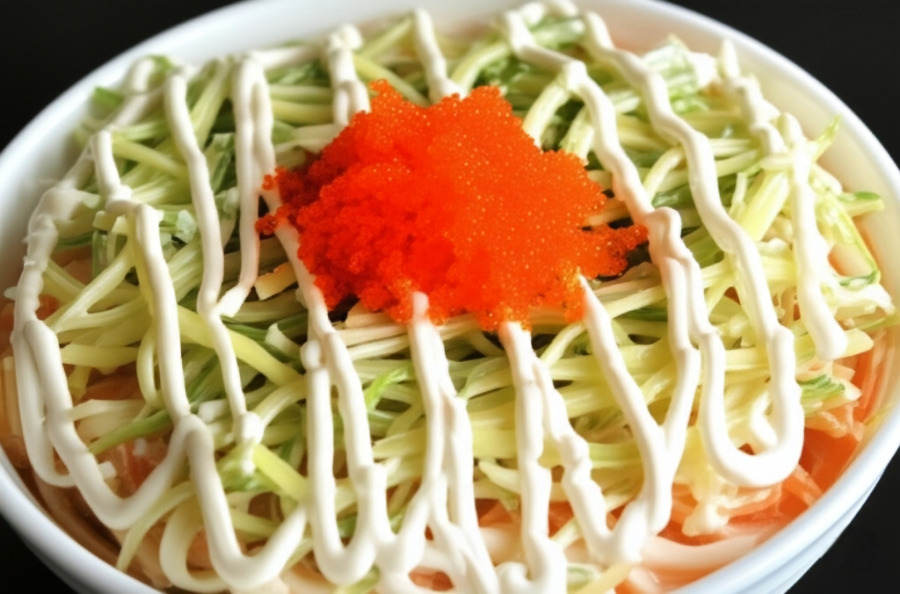 <이미지: 하얀 천사채와 잘게 찢은 맛살, 채 썬 오이나 당근 등이 크리미한 하얀 양념에 버무려져 볼이나 접시에 담겨 있는 모습.>