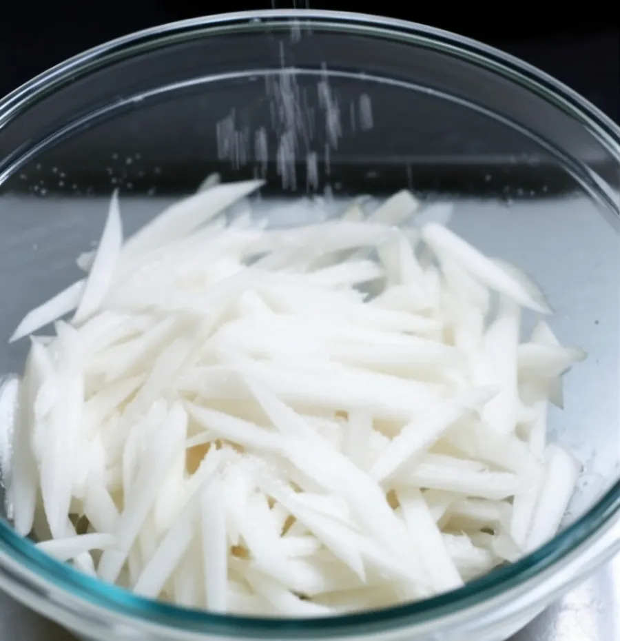 <이미지: 채 썬 무가 담긴 볼에 소금을 넣고 손으로 버무리는 모습.>