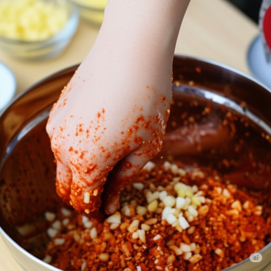 ② 위생장갑을 끼고 손으로 무가 부서지지 않도록 살살 털어가며 양념 색이 고루 배도록 버무려줍니다. 고춧가루 색이 무에 예쁘게 물들 때까지 구석구석 버무려주세요.