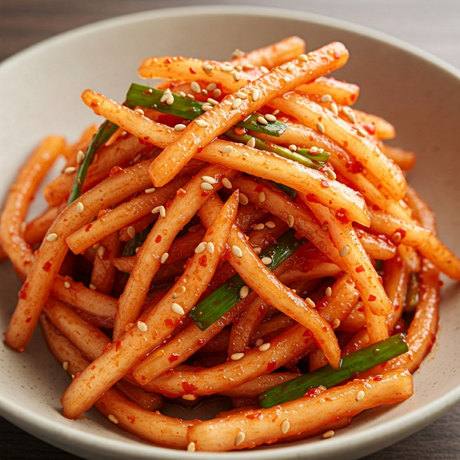 <이미지: 주황색 붉은 빛깔의 무생채가 접시에 담겨 있고, 파와 깨소금이 뿌려져 먹음직스러워 보인다. 식감이 느껴지는 아삭한 모습이다.>