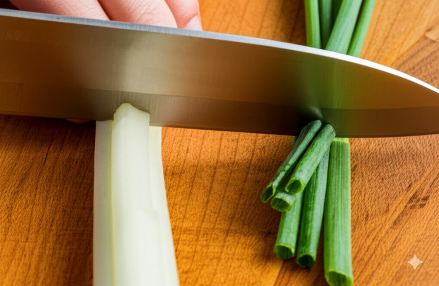 <이미지: 대파의 흰 부분과 초록 부분을 칼로 송송 써는 모습.>