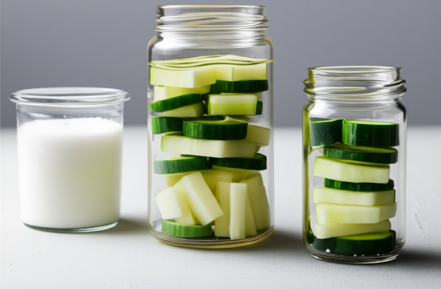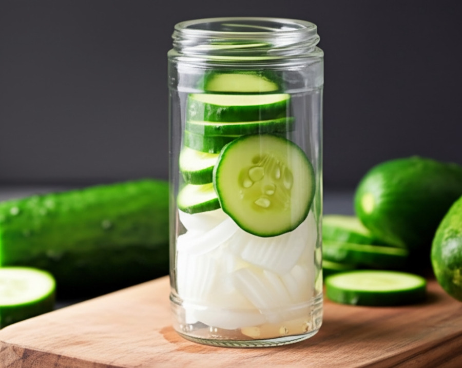 <이미지: 유리병에 오이와 양파를 담는 모습>