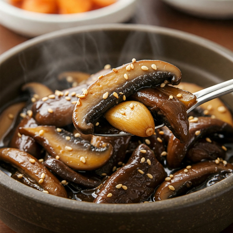 <이미지: 냄비나 접시에 담긴 갈색 빛깔의 버섯조림. 쫄깃한 버섯과 채소, 윤기 흐르는 양념이 어우러져 먹음직스러워 보인다.>