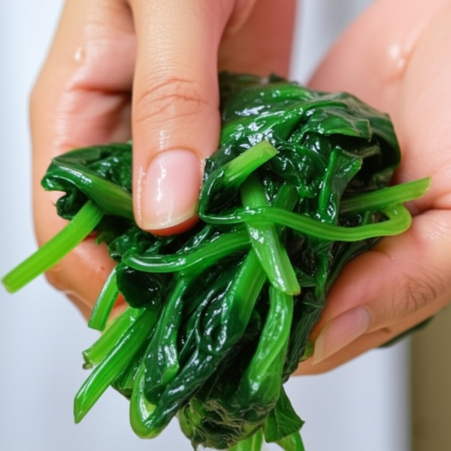 <이미지: 찬물에 식힌 시금치를 건져내서 두 손으로 물기를 꽉 짜내는 모습.>