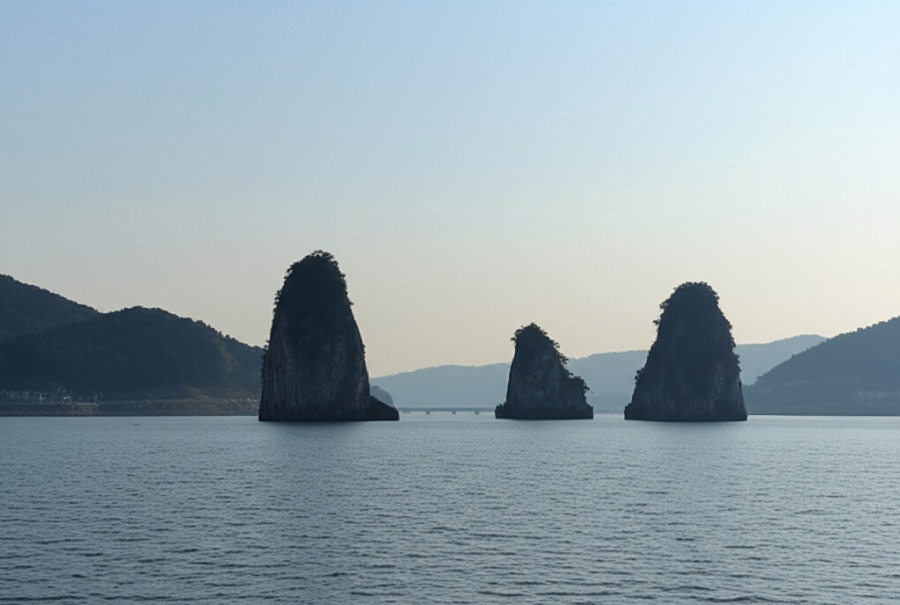 <이미지: 도담삼봉과 석문 전경 또는 유람선 사진>
