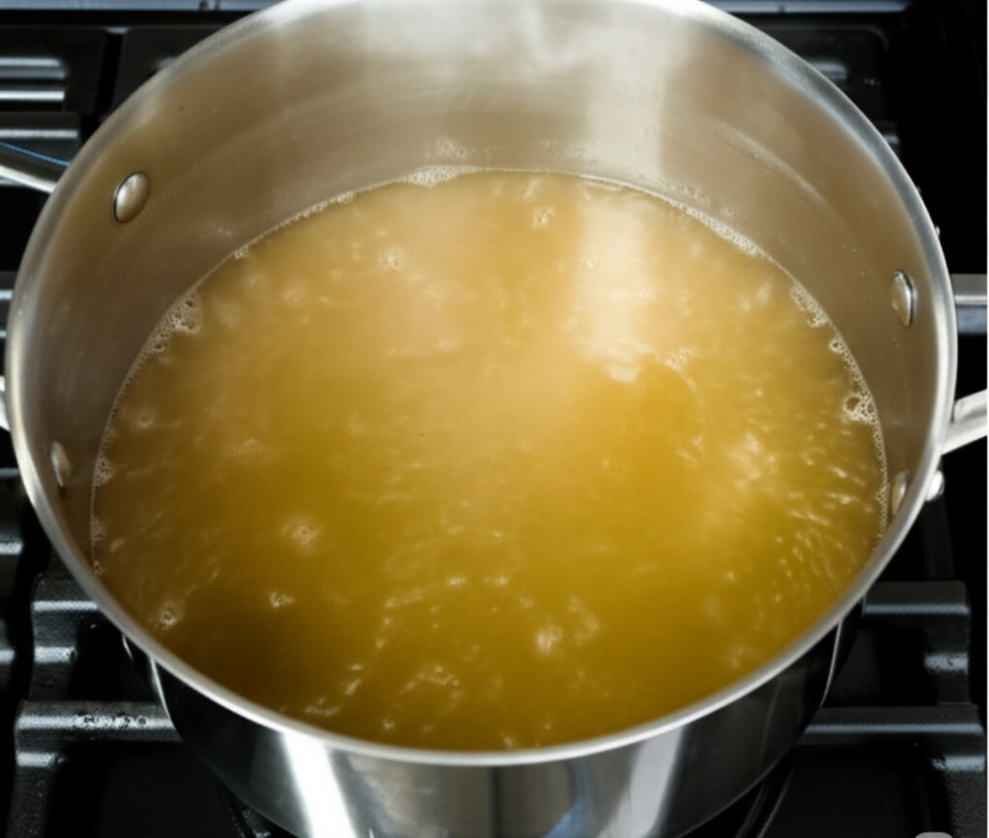 <이미지: 볶은 재료에 물 또는 쌀뜨물을 붓고 끓이는 모습>