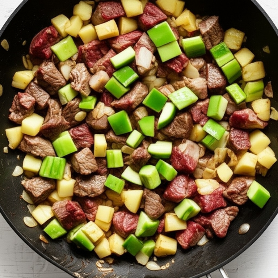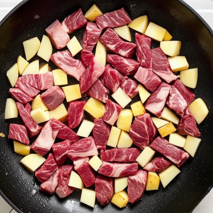 <이미지: 돼지고기와 감자, 양파, 애호박을 넣고 함께 볶는 모습>