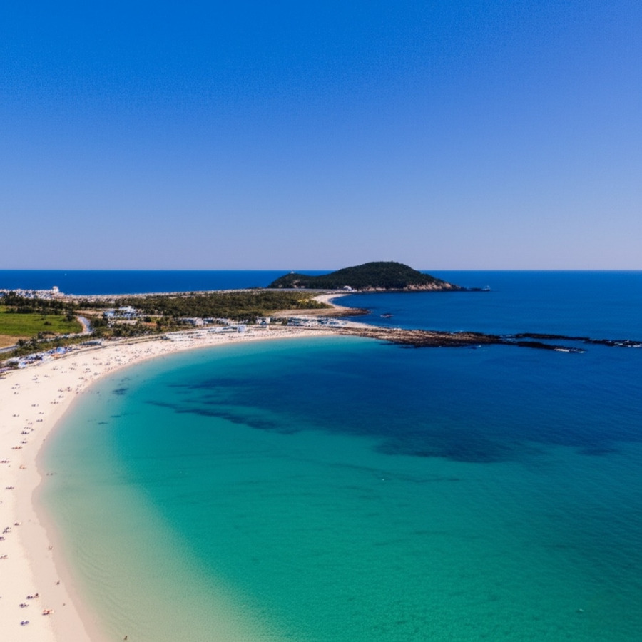<이미지: 에메랄드빛 바다와 비양도가 보이는 협재/금능 해수욕장 풍경>