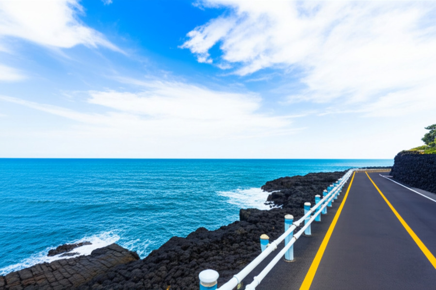 <이미지: 애월 해안도로를 따라 시원하게 펼쳐진 푸른 바다 풍경>