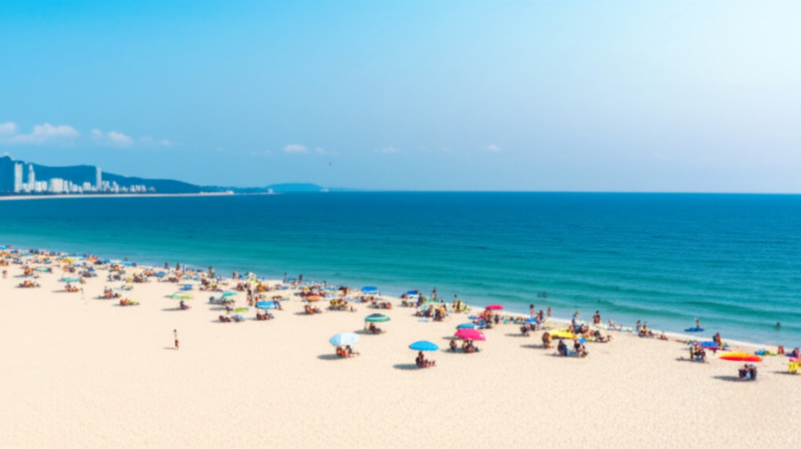 <이미지: 넓은 백사장과 푸른 바다가 펼쳐진 해운대 해변의 활기찬 풍경>