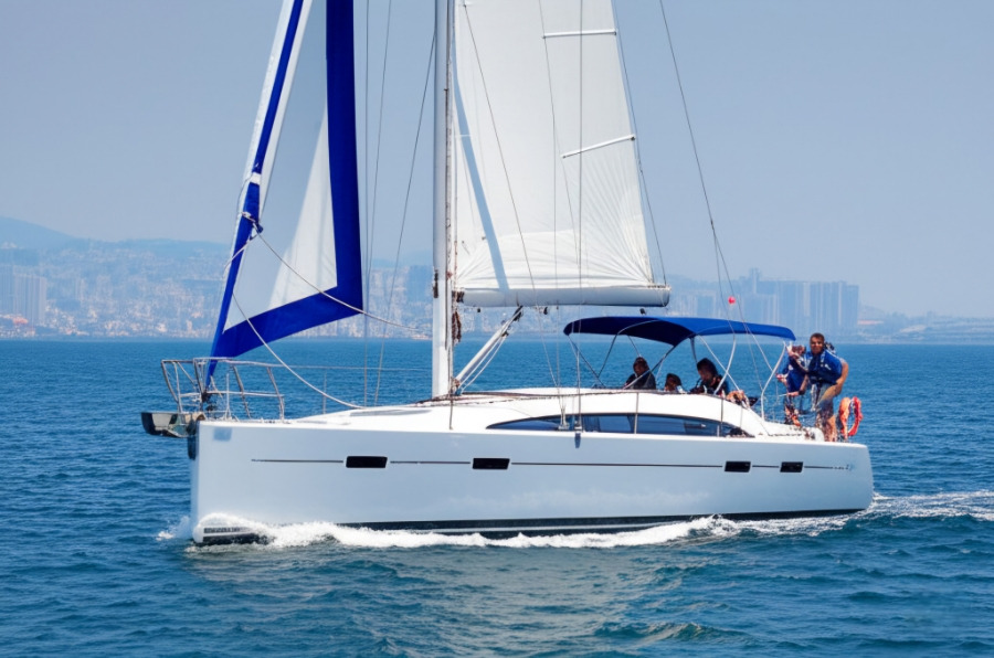 <이미지: 푸른 바다 위를 항해하는 요트와 해운대 해변의 풍경>