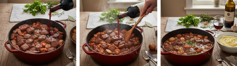 - 와인의 역할: 드라이한 레드 와인은 산미와 타닌을 제공하여 쇠고기의 풍미를 끌어올리고, 오랜 시간 끓이는 과정에서 알코올이 날아가 깊은 포도 향만 남게 됩니다.