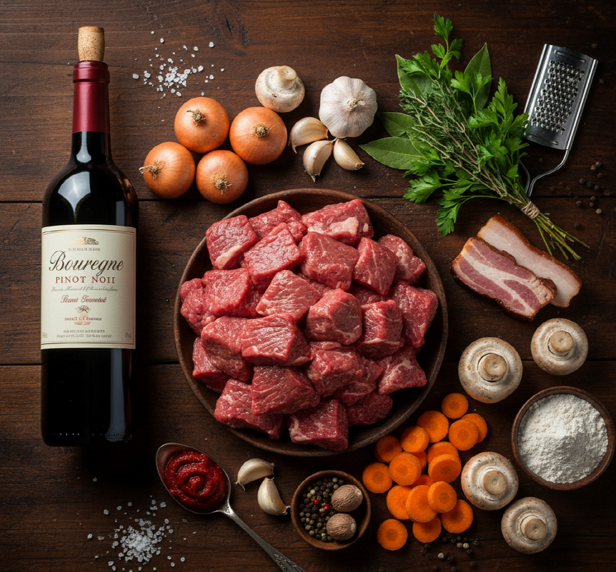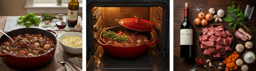 **뵈프 부르기뇽(Bœuf Bourguignon)**은 프랑스 부르고뉴 지방의 전통적인 쇠고기 스튜로, 레드 와인에 쇠고기를 뭉근하게 브레이징(Braising)하여 만들어내는 깊고 진한 풍미가 특징입니다. 영화 '줄리 앤 줄리아'를 통해 전 세계적으로 알려진 이 요리는 단순한 가정식을 넘어, 시간과 정성이 만들어낸 프랑스 요리의 정수로 불립니다.