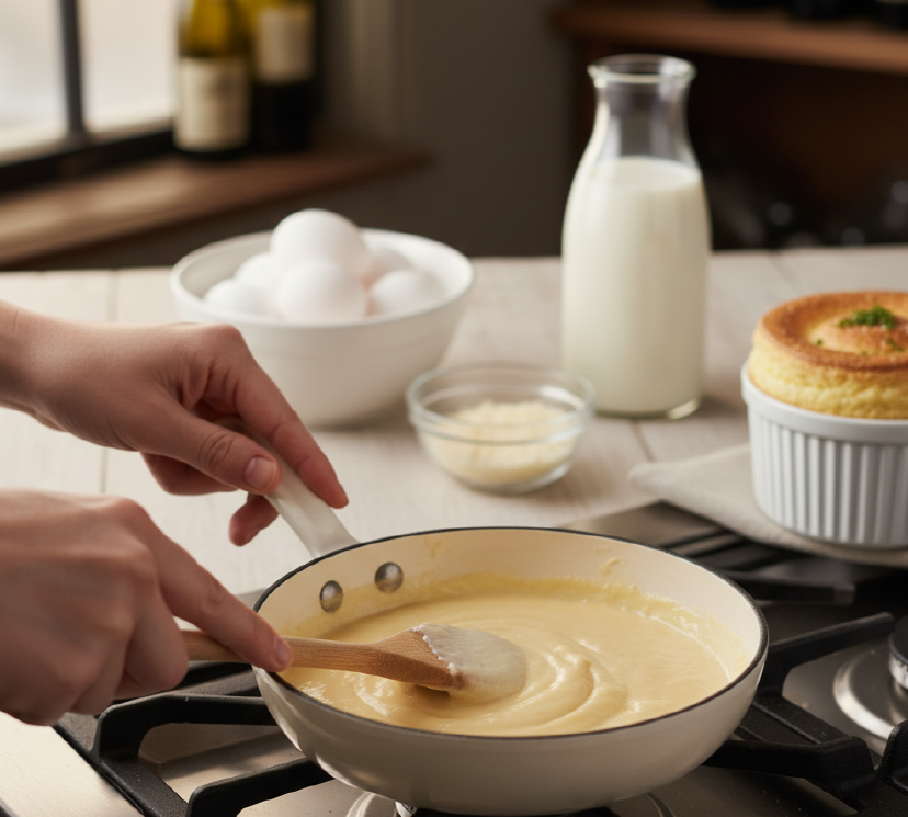 - 갈아놓은 그뤼에르 치즈, 소금, 백후추, 넛맥(선택 사항)을 넣고 잘 섞어 수플레 베이스를 완성합니다.