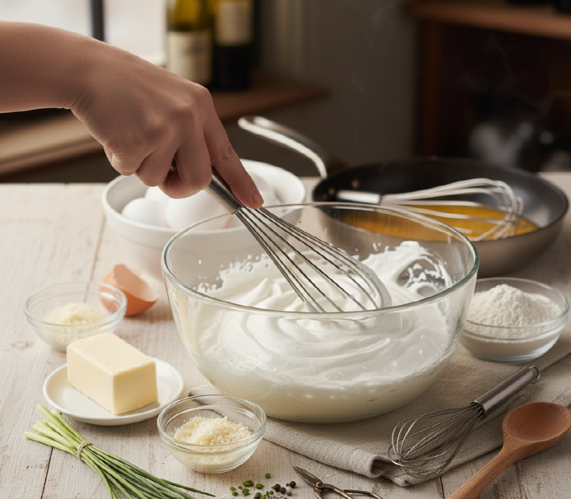 - 머랭의 중요성: 수플레의 9할은 머랭이라고 할 수 있습니다. 뿔이 단단하게 설 정도로 충분히 휘핑해야 해요.