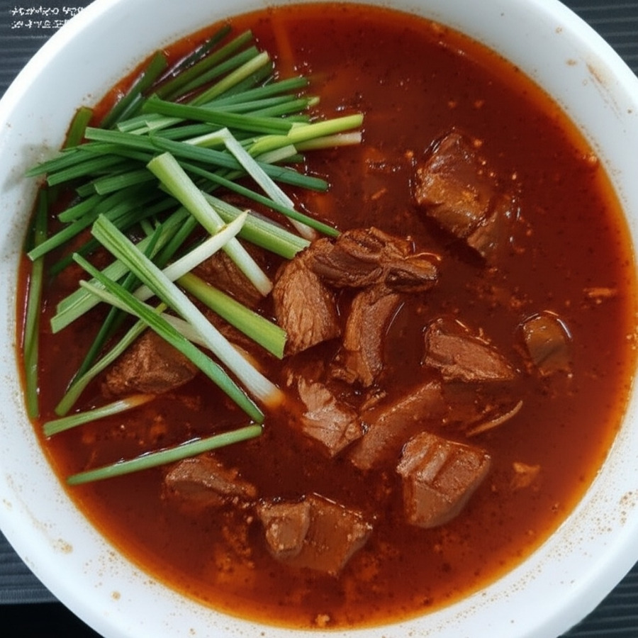 <이미지: 뚝배기 또는 그릇에 담긴 경상도식 소고기무국. 붉은빛의 국물 위로 큼직하게 썰린 소고기 조각과 무, 대파가 보이고, 김이 모락모락 올라오는 뜨끈하고 칼칼한 느낌>