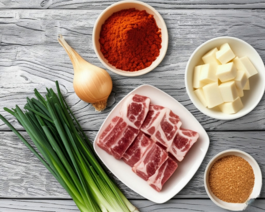 <소고기 국거리용, 무, 대파 등의 주재료와 다진 마늘, 고춧가루, 국간장, 참기름 등 양념 재료들이 정갈하게 놓여있는 모습>