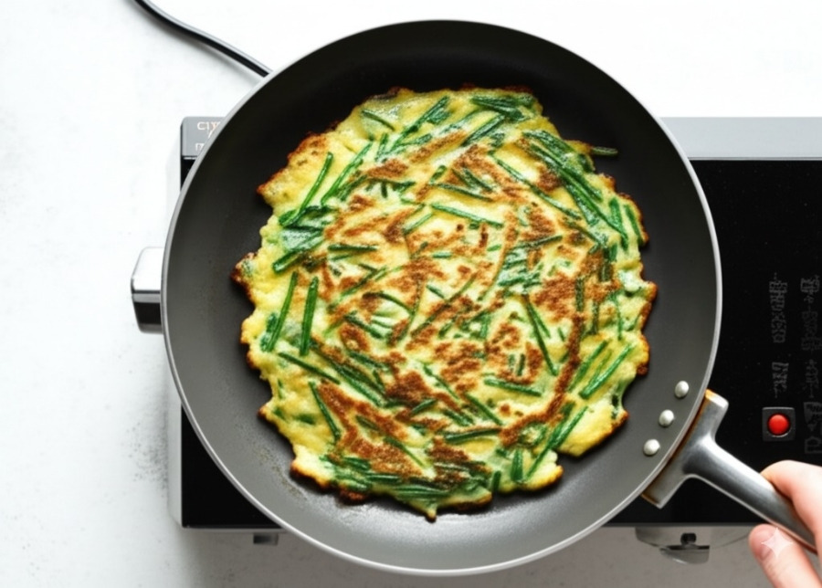 <이미지: 노릇하게 구워진 미나리전을 뒤집는 모습>