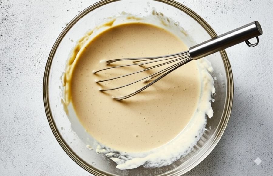 <이미지: 볼에 부침가루와 찬물을 넣고 거품기로 저어 반죽을 만드는 모습>